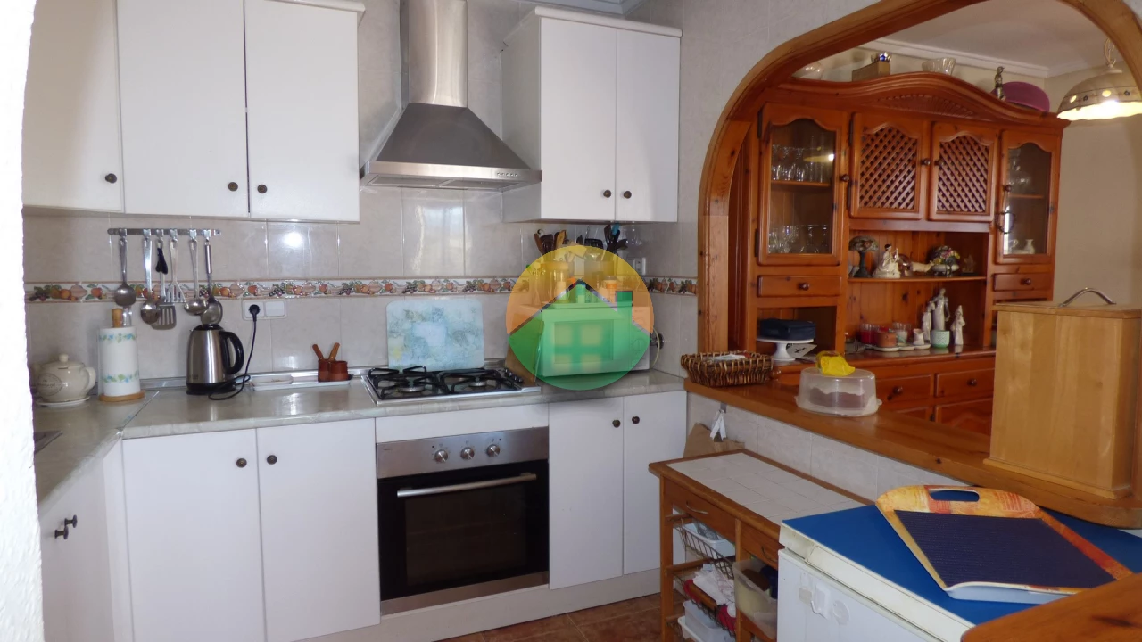 On entering the villa, to the right is the dining area and to the left the spacious lounge. As this is a double aspect room, there is plenty of natural light and a great sense of space. The lounge has had the fireplace and units removed making this a bigger area and there is a gas wall mounted fireplace, 3 panel heaters, a ceiling fan & air conditioning ensuring your comfort no matter the season. The dining area also has a panel heater. Through from the lounge via an archway is the kitchen. The kitchen is well proportioned and comes with plenty of cupboard space and worktop areas. There is a water filter system and a gas boiler for hot water.